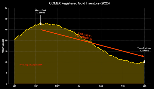 COMEX gold inventory dropped 25% last year alone. The gold is flowing East. Shanghai. Mumbai. Moscow.