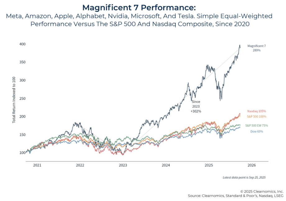 This chart shows just how much the “Magnificent 7” stocks have pulled ahead of the rest of the market. Since the end of 2020, the S&P 500 and Nasdaq have both doubled, but the Magnificent 7 climbed nearly 3x higher.