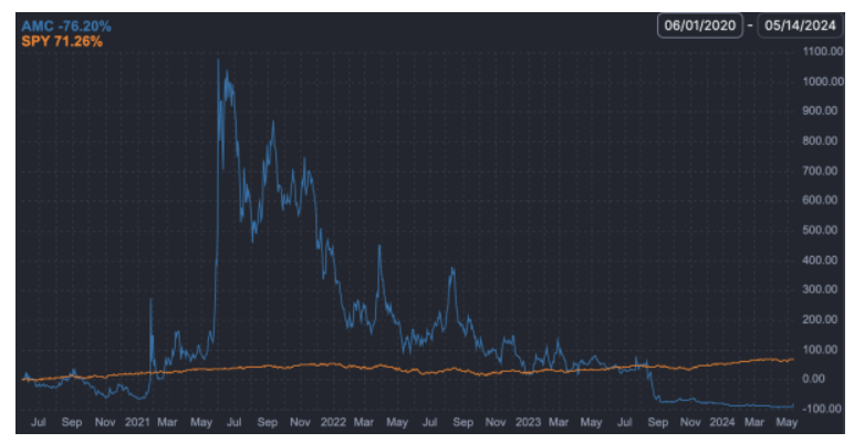 GameStop continued to reap the benefits of higher stock prices than before the short squeezes in 2021. But others, like AMC, dipped lower than their pre-pandemic values, as shown in this chart: