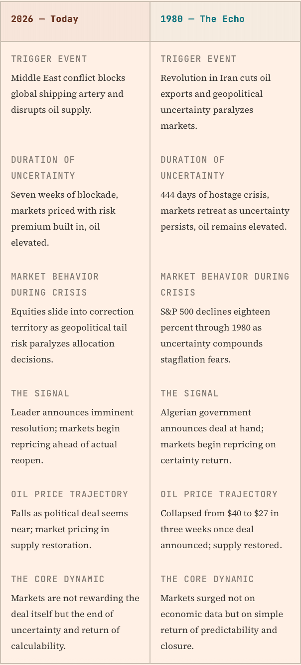 The duration this time is measured in weeks, not months or years. The Strait of Hormuz has been closed for less than fifty days. In 1980, the uncertainty lasted 444 days. The speed of resolution is what's unprecedented. Markets hate uncertainty, but they have become accustomed to waiting through it. This time they are not waiting. The anticipation is collapsing the timeline.